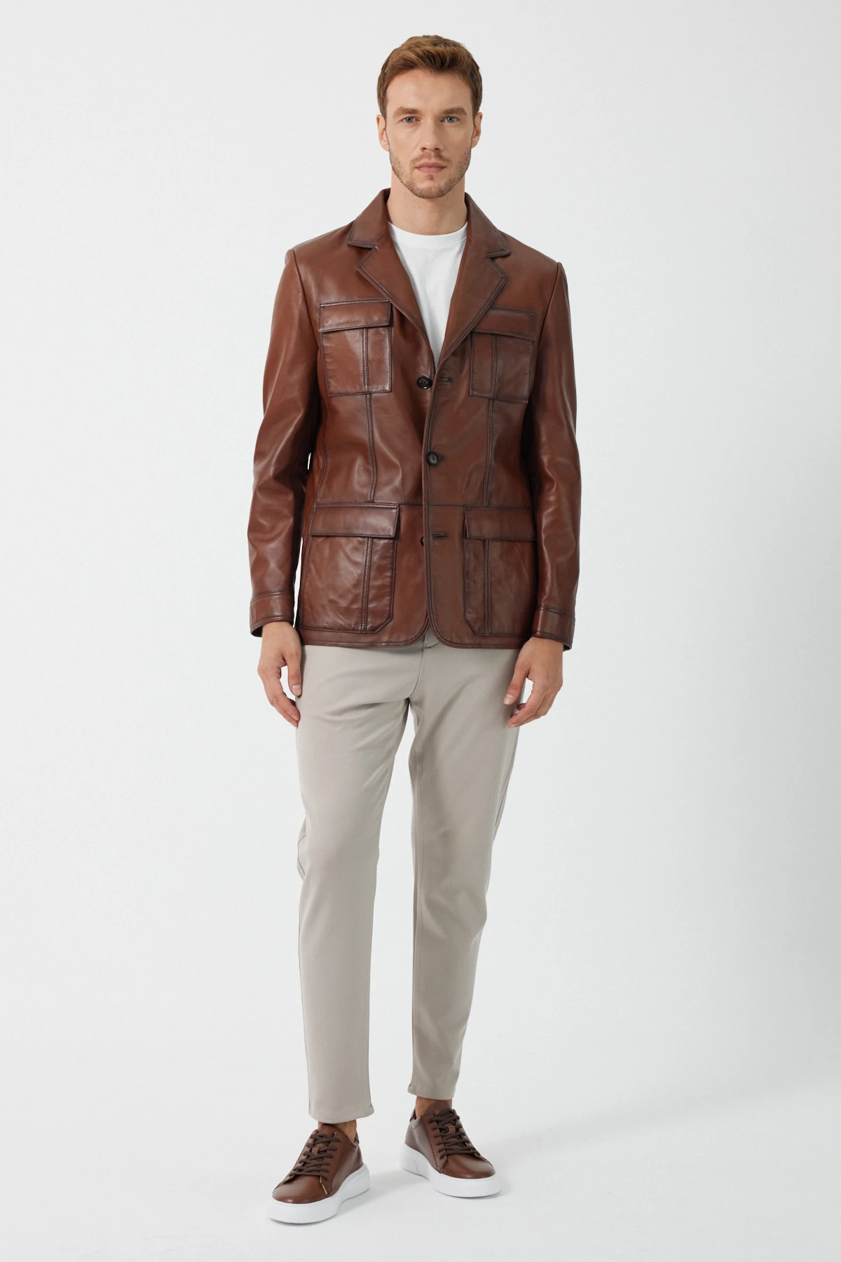 Sezar Deri Mont, her zevke ve tarza hitap eden üç farklı renk seçeneğiyle sunuluyor: Asil ve klasik siyah, sıcak ve doğal kahverengi, özgün ve dikkat çekici taba. 190 cm boyunda ve 48/50 (Medium) beden manken üzerinde kusursuz bir duruş sergileyen Sezar, geniş beden skalasıyla her vücut tipine uyum sağlıyor.